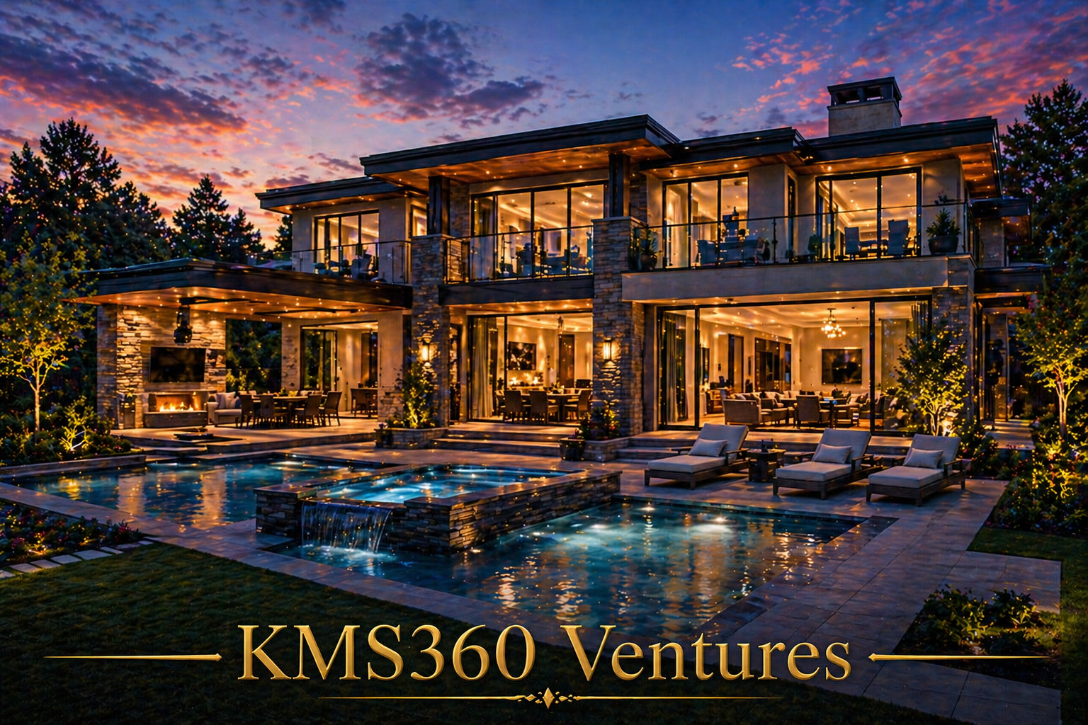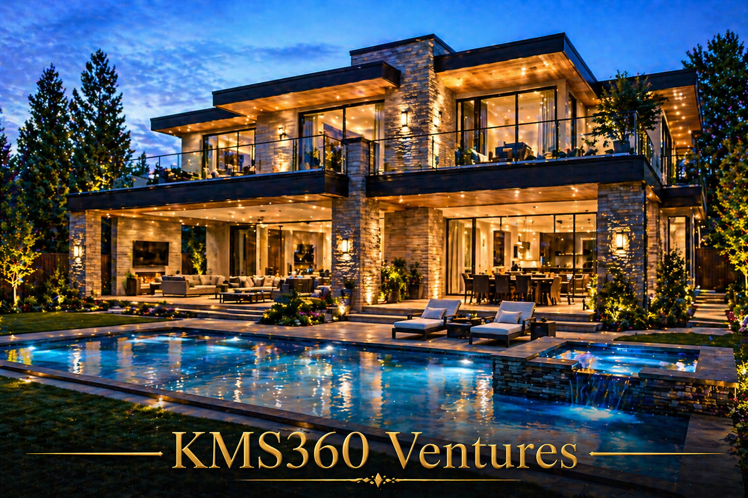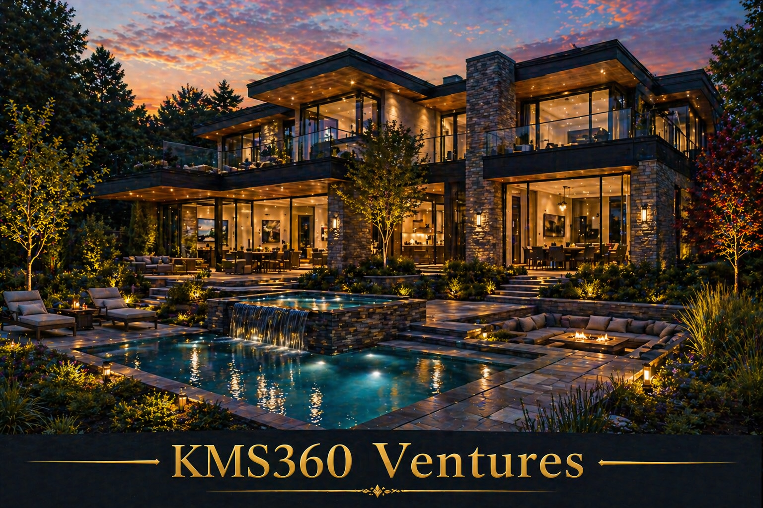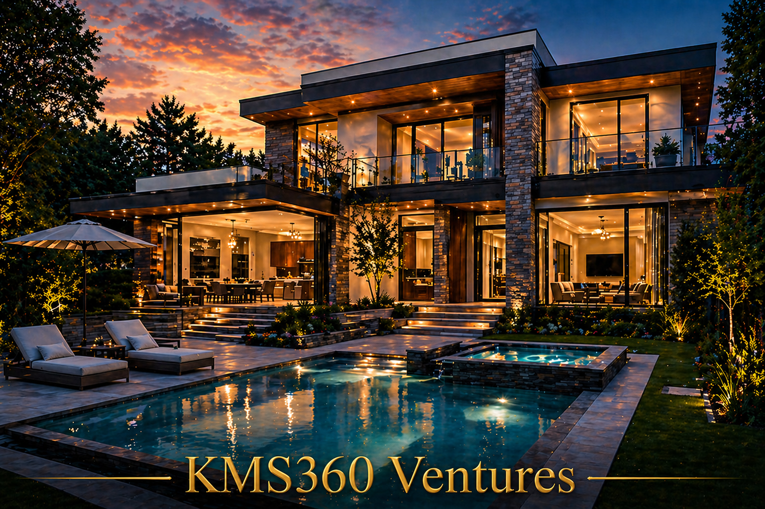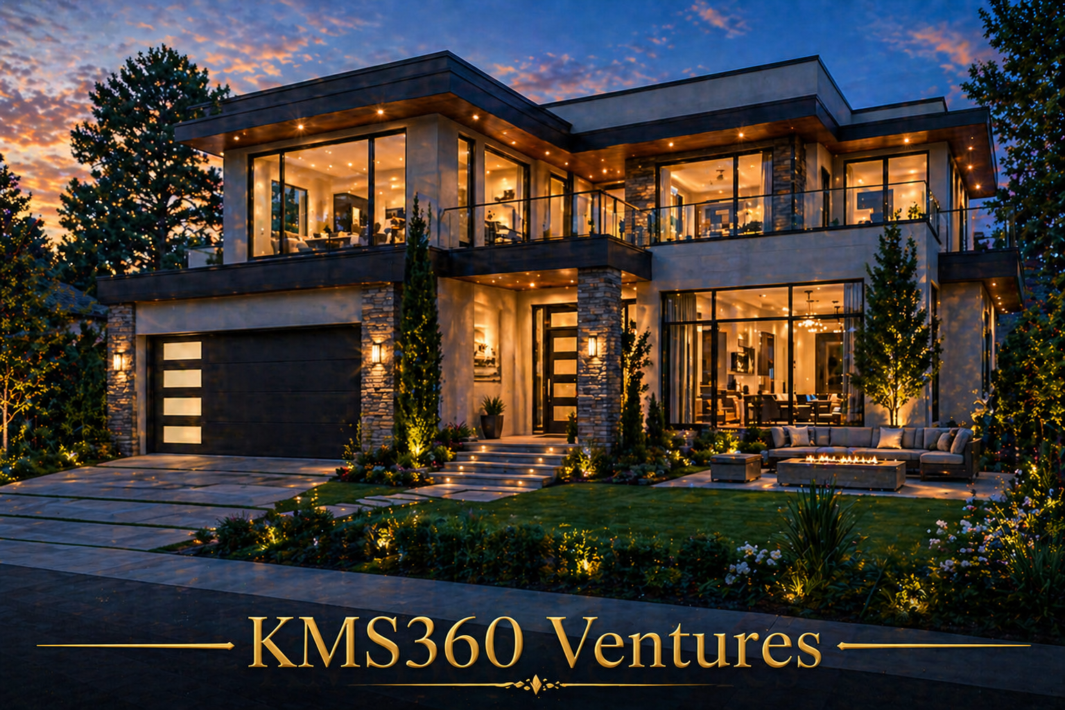 • A modern luxury home illuminated by warm ambient lighting creates a rich and elegant evening atmosphere. The beautifully landscaped exterior and stylish architecture reflect premium living and sophistication.